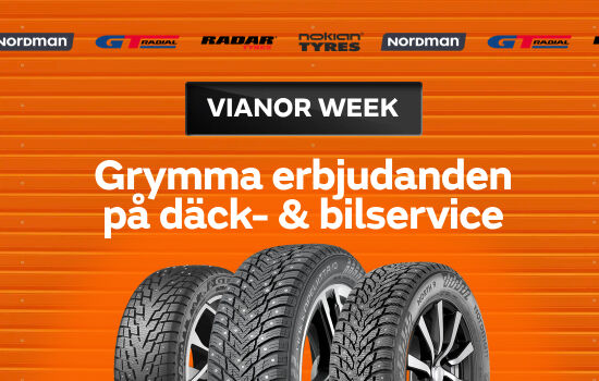 Vianor Weeks erbjudanden gäller på Vianors ordinarie butikspris t.o.m. 30.11.2025 i webbshop och Vianor verkstäder (ej Vianor Partners). Erbjudanden kan inte kombineras med andra avtal, erbjudanden eller rabatter.