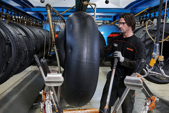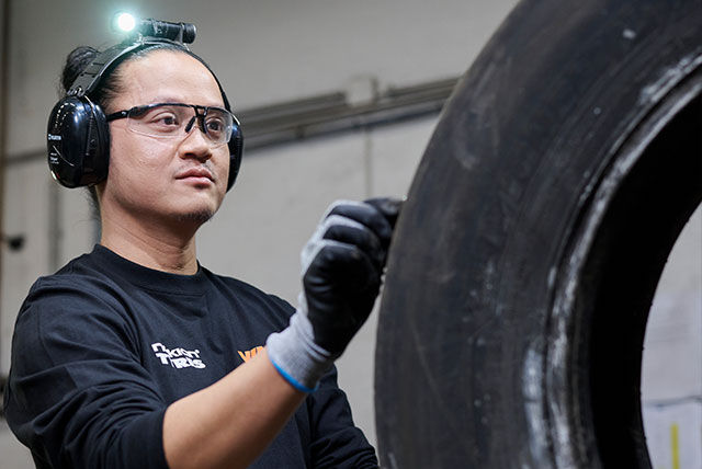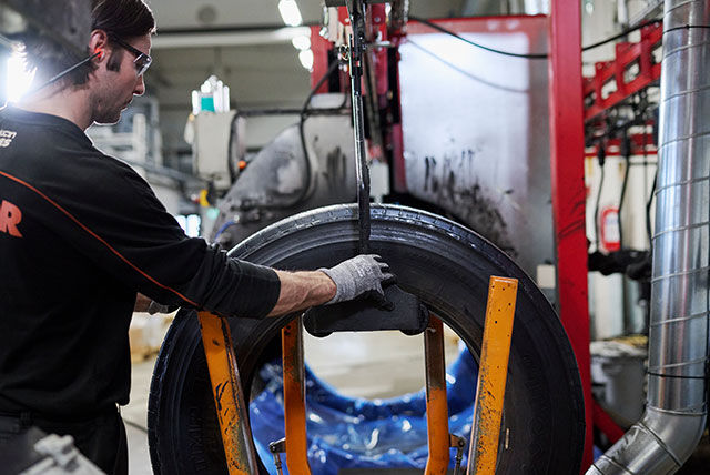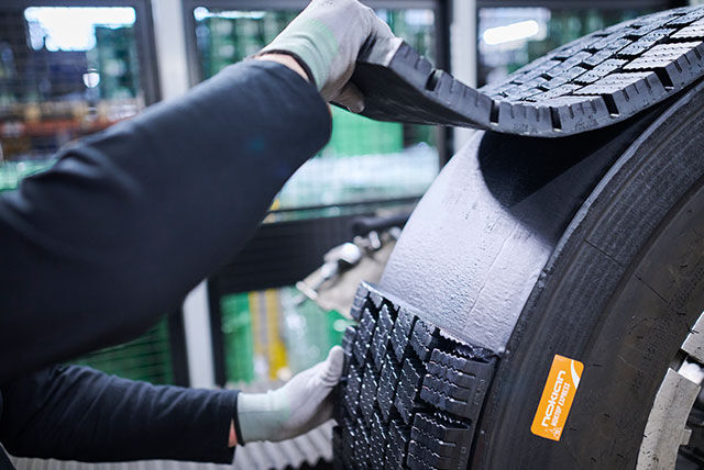 Regummering i Vianors egna fabrik ger däcken ett andra liv. När slitbanan är utsliten tas den bort, och den intakta däcksstommen får en ny, slitstark slitbana.